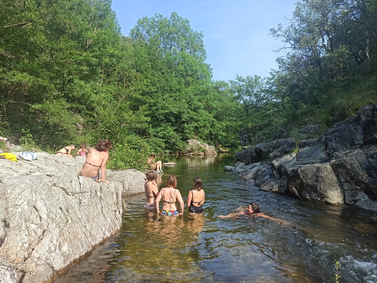Nous avons également bénéficié de conditions parfaites au cours de ces 2 jours : au delà du temps superbe dont nous avons pu profiter tout le week-end, et en particulier la journée du samedi, la rivière située sur la propriété était chargée de l’eau des orages des semaines précédentes et nous n’avions jamais vu l’eau couler aussi puissamment des deux cascades. La rivière a ainsi été joyeusement prise d’assaut par les participants pendant les temps de pause.