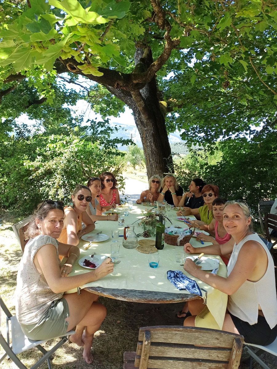Un groupe de quinze femmes a participé avec nous à cette retraite. Et quel groupe ! Quinze femmes motivées et impliquées dans les pratiques. Parmi elles, la moitié avait déjà pris part à nos retraites, dans les Alpes et/ou dans les Cévennes. L’autre moitié venait pratiquer avec nous pour la première fois.