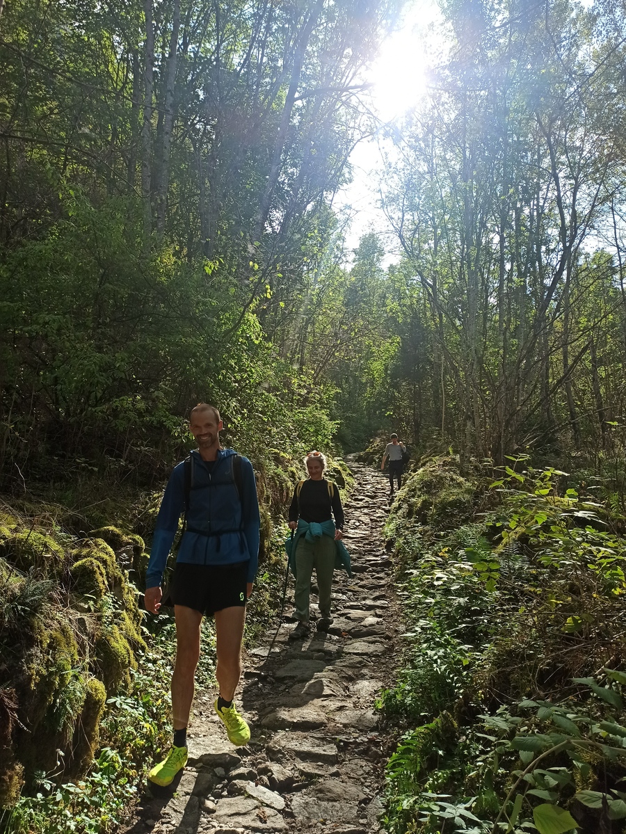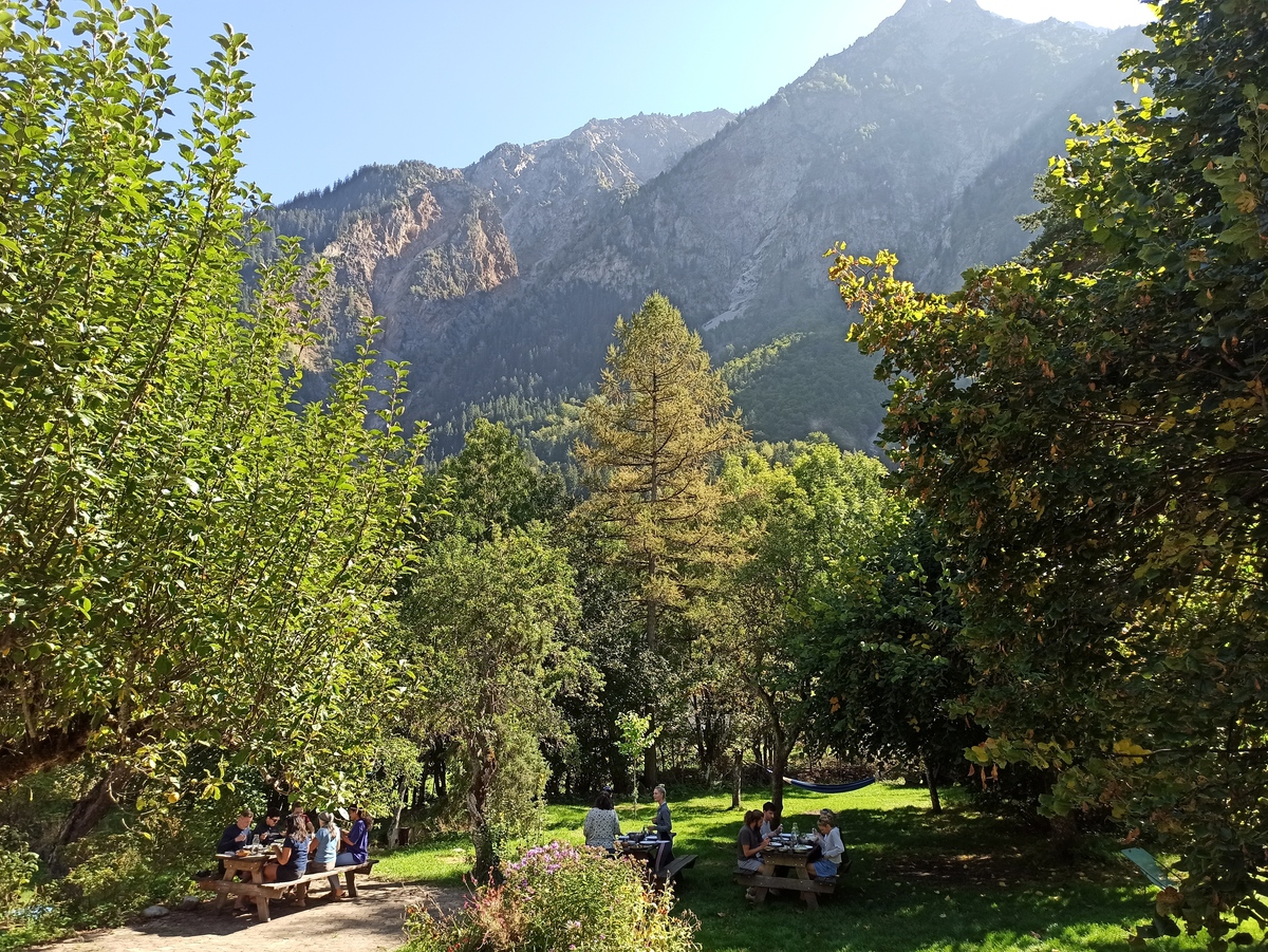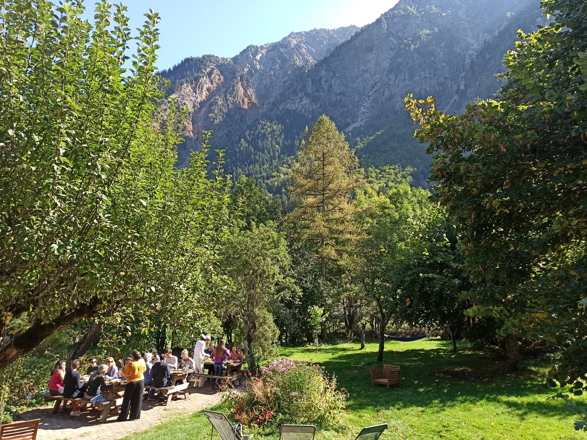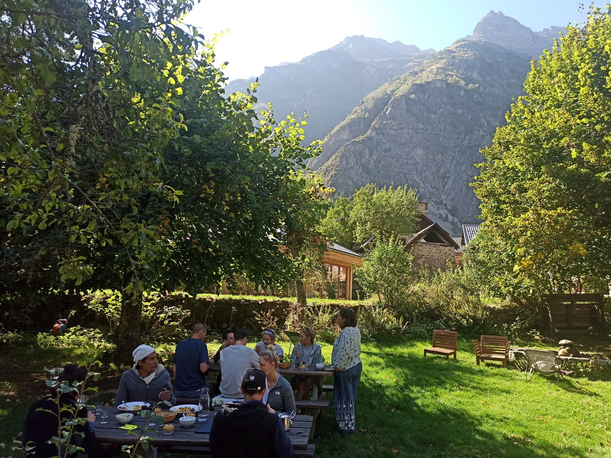 La météo idéale dont nous avons bénéficié cette semaine n’a fait que renforcer la magie du site. Quel bonheur de cheminer sur les sentiers entourés de montagnes, de pratiquer sous les lumières dorées du début de l’automne et de déjeuner dehors dans un cadre à couper le souffle !
