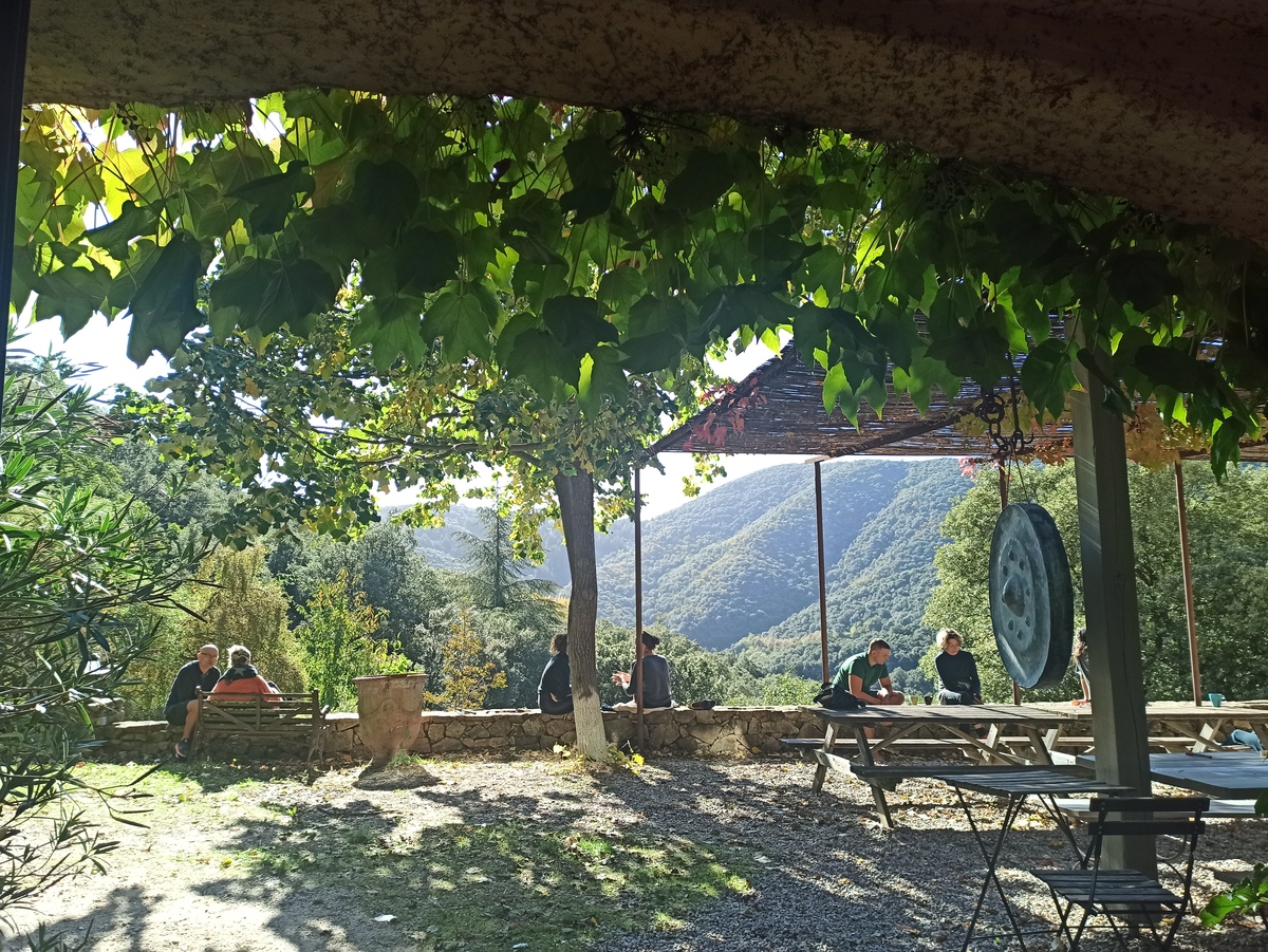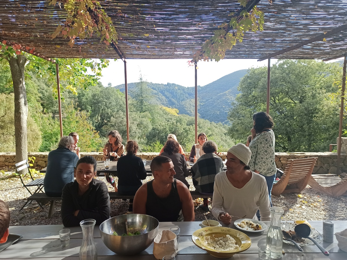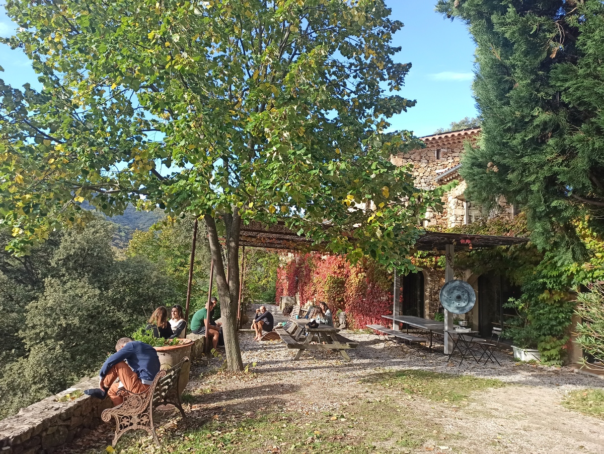 La journée délicieusement ensoleillée du samedi nous a permis de profiter pleinement des extérieurs, donnant la possibilité de belles marches pendant les temps de pause parmi les chênes et les châtaigniers pour certains, de baignades à la rivière pour d’autres, ou encore de lectures et de discussions devant la vue imprenable sur les collines cévenoles.